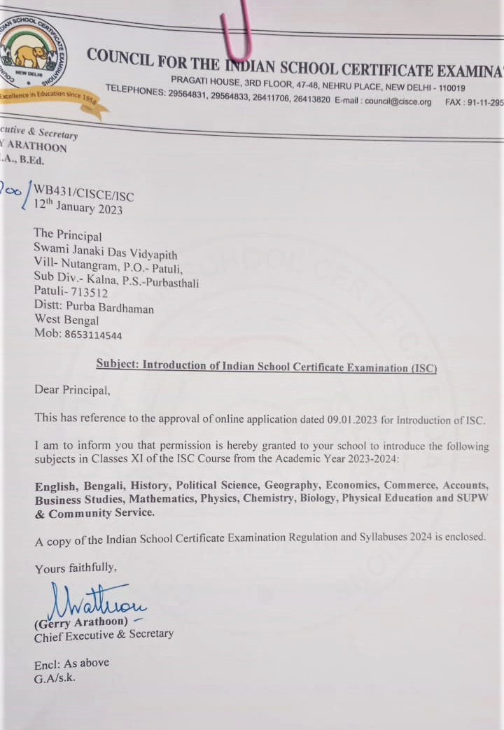The school has received ISC (Senior Secondary level) approval with respect to the following subjects: